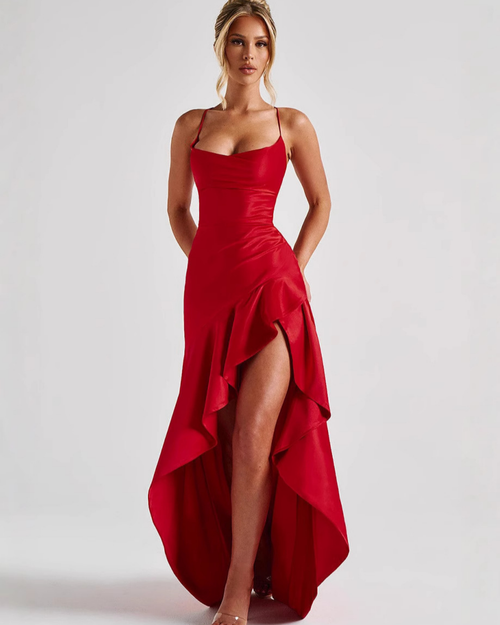 Ruffle Detail Open-Back Halter Maxi Dress